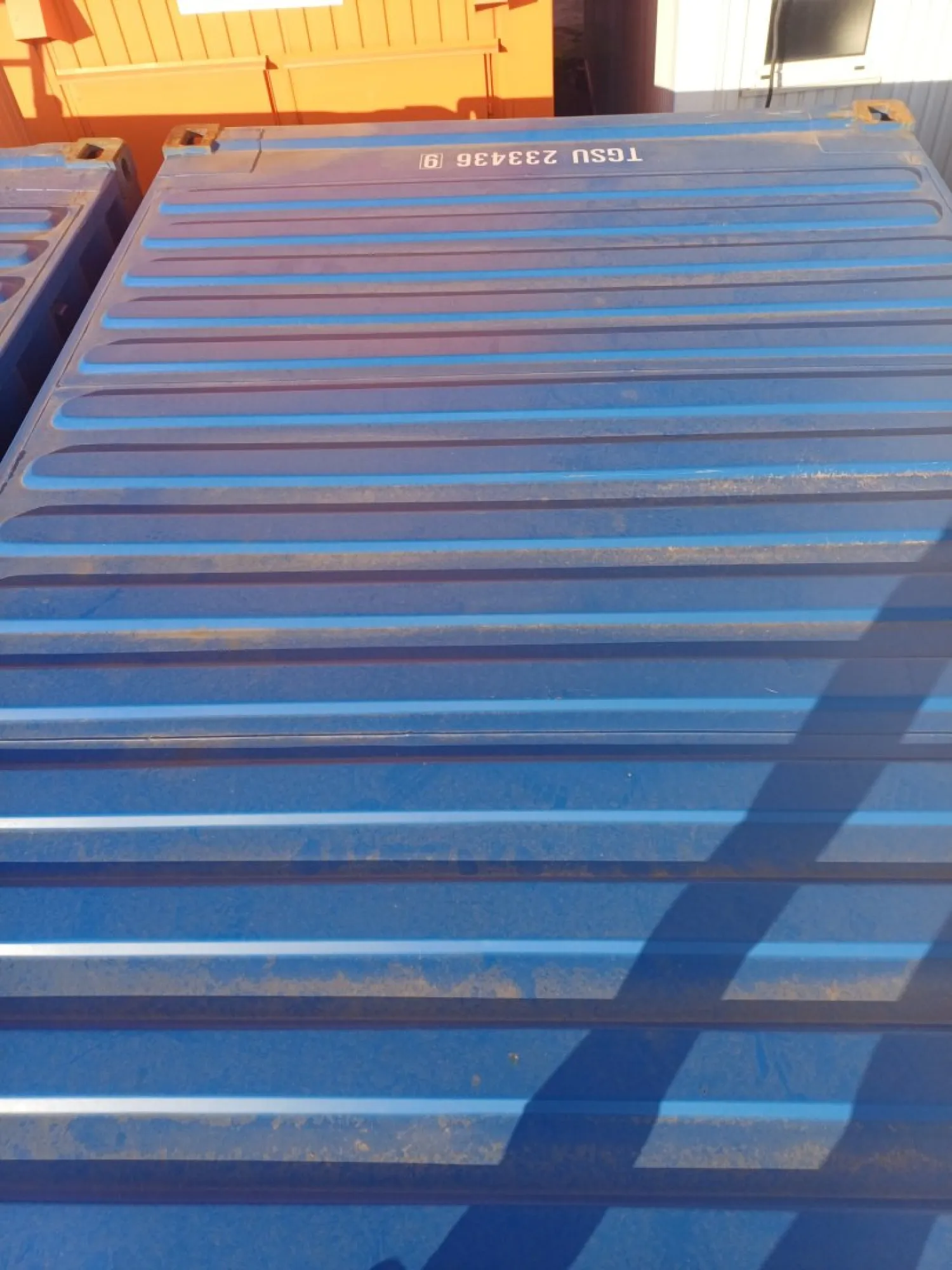 Kontejner vykazuje mírné známky opotřebení, mj. odření, promáčknutí a různý stupeň vyblednutí barvy.