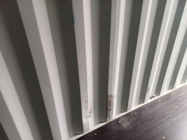 Kontejner vykazuje mírné známky opotřebení, mj. odření, promáčknutí a různý stupeň vyblednutí barvy.