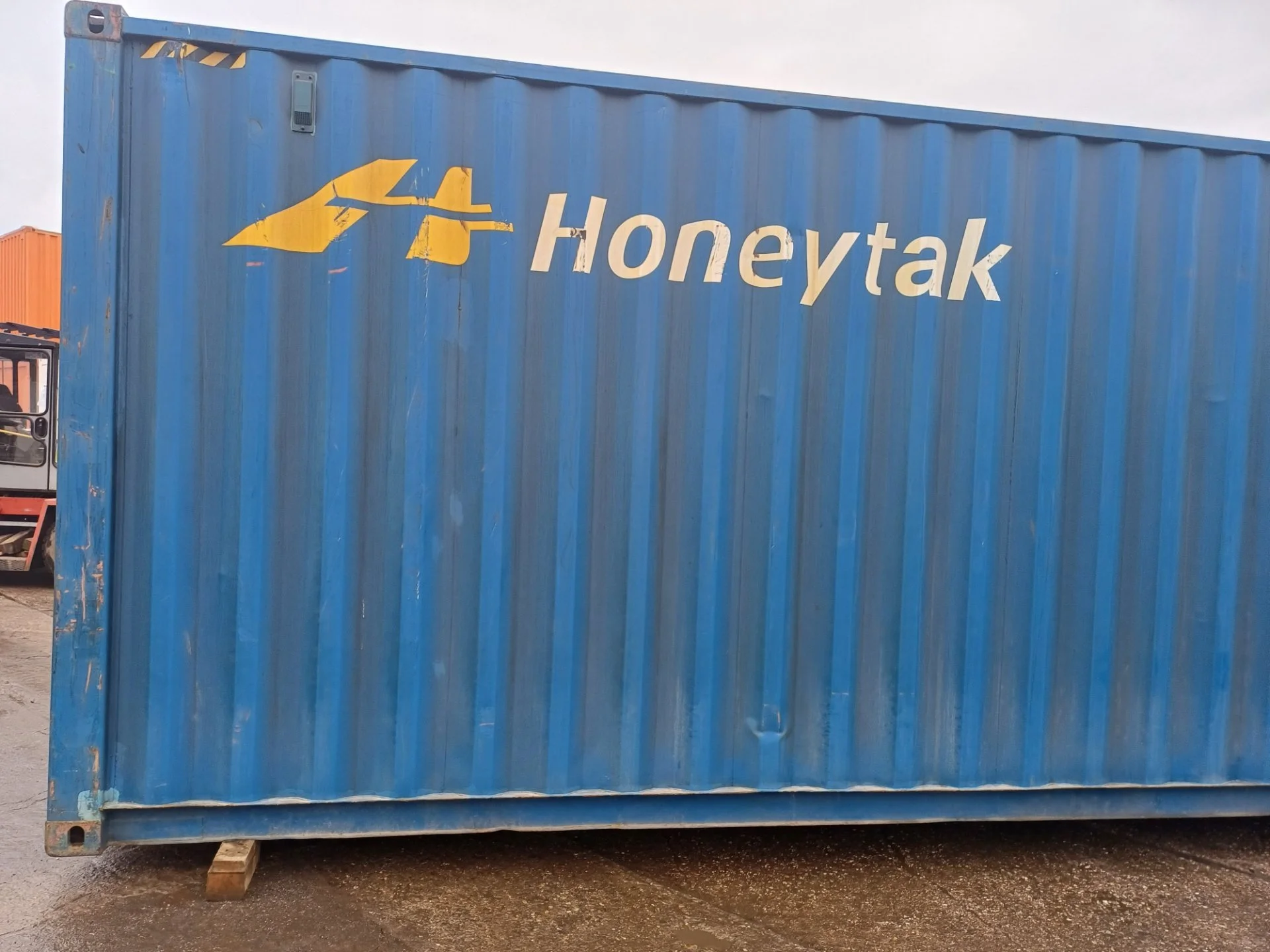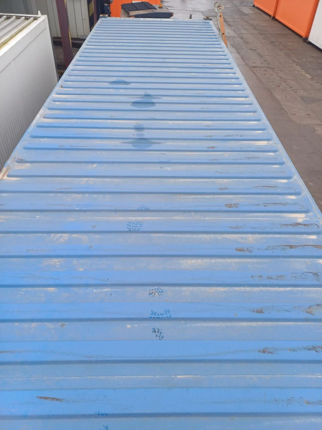Kontejner vykazuje mírné známky opotřebení, mj. odření, promáčknutí a různý stupeň vyblednutí barvy.