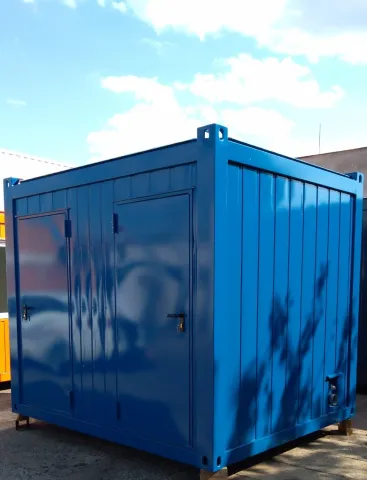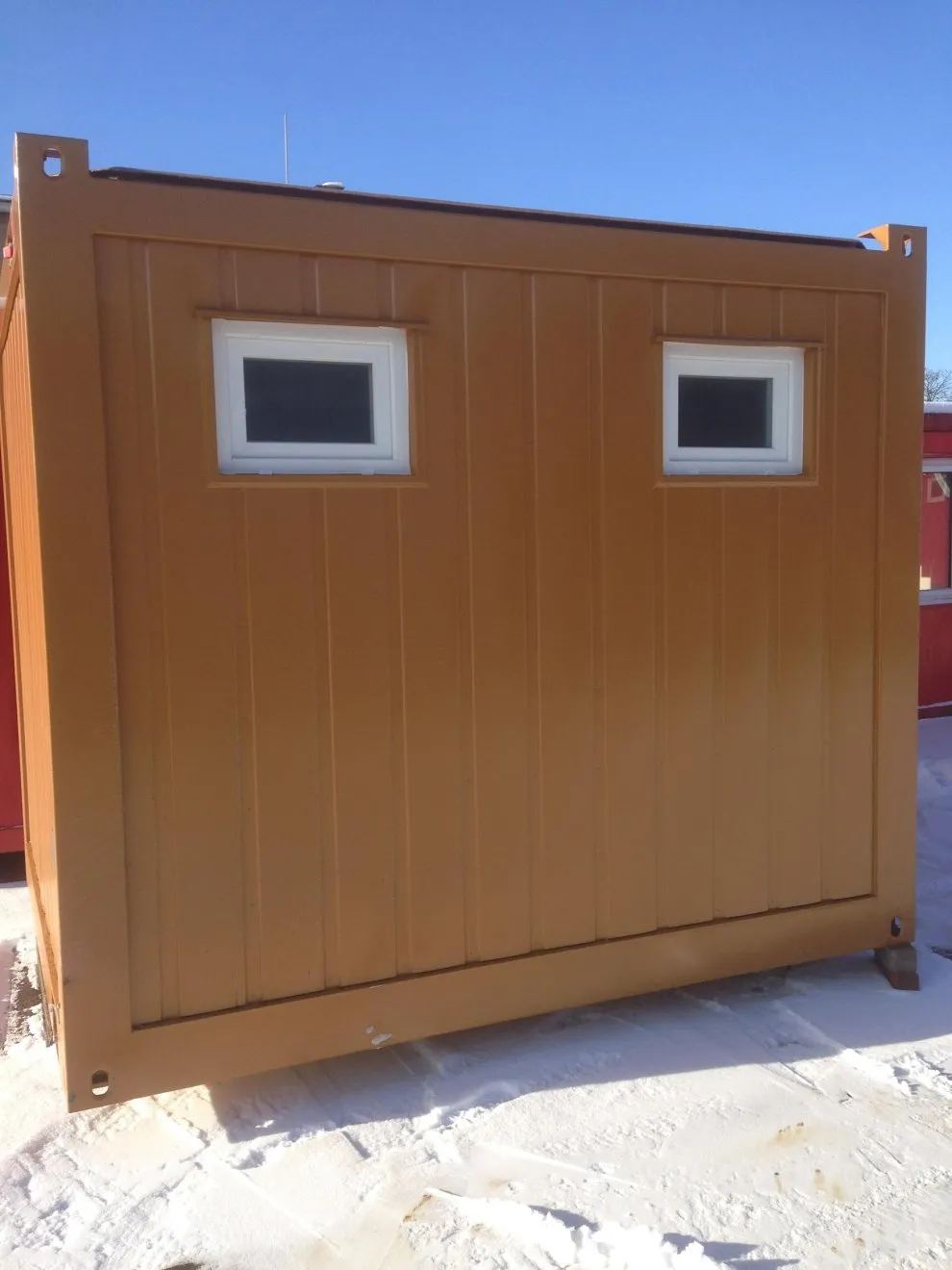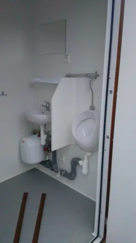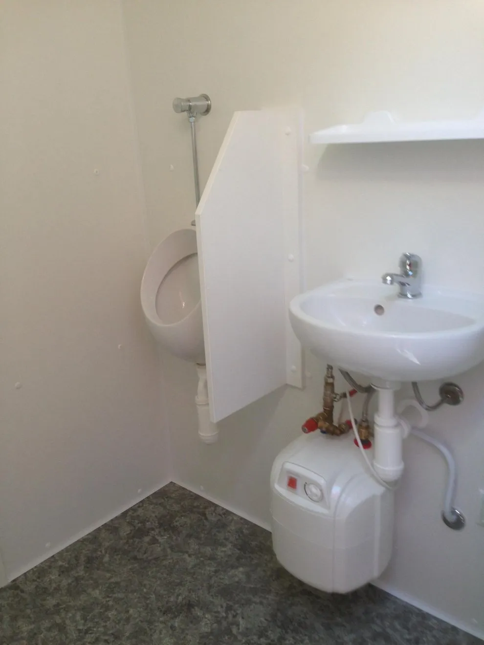 2 x venkovní, ocelové dveře 875 x 2000 mm 2 x sanitární okno 600 x 450 mm 1 x mezistěna 1 x pisoár 2 x keramické umyvadlo 2 x průtokový ohřívač 2 x zrcadlo 2 x věšák na oblečení 2 x toaletní kabina se záchodovou mísou, vnitřní dveře 2 x držák na papír (2 x topení – za příplatek) |