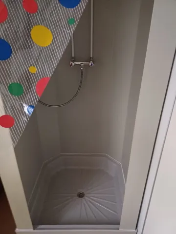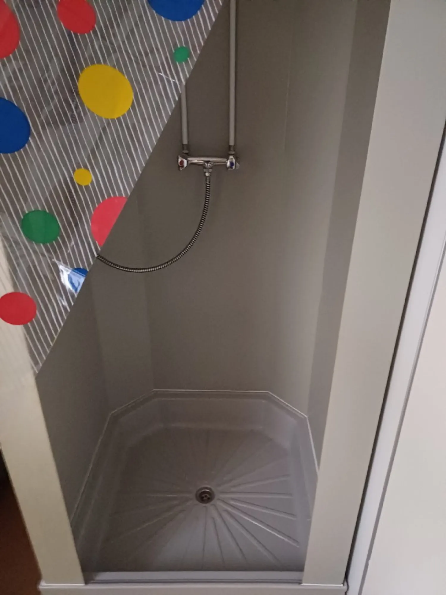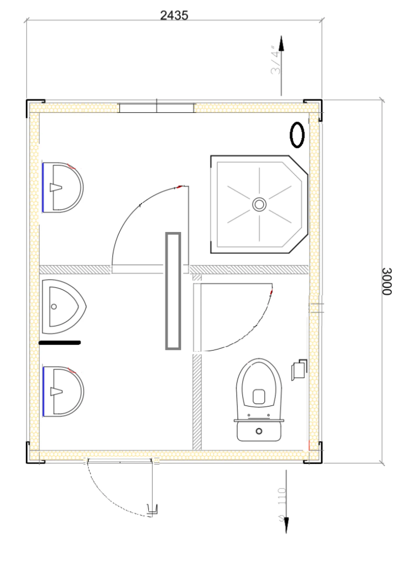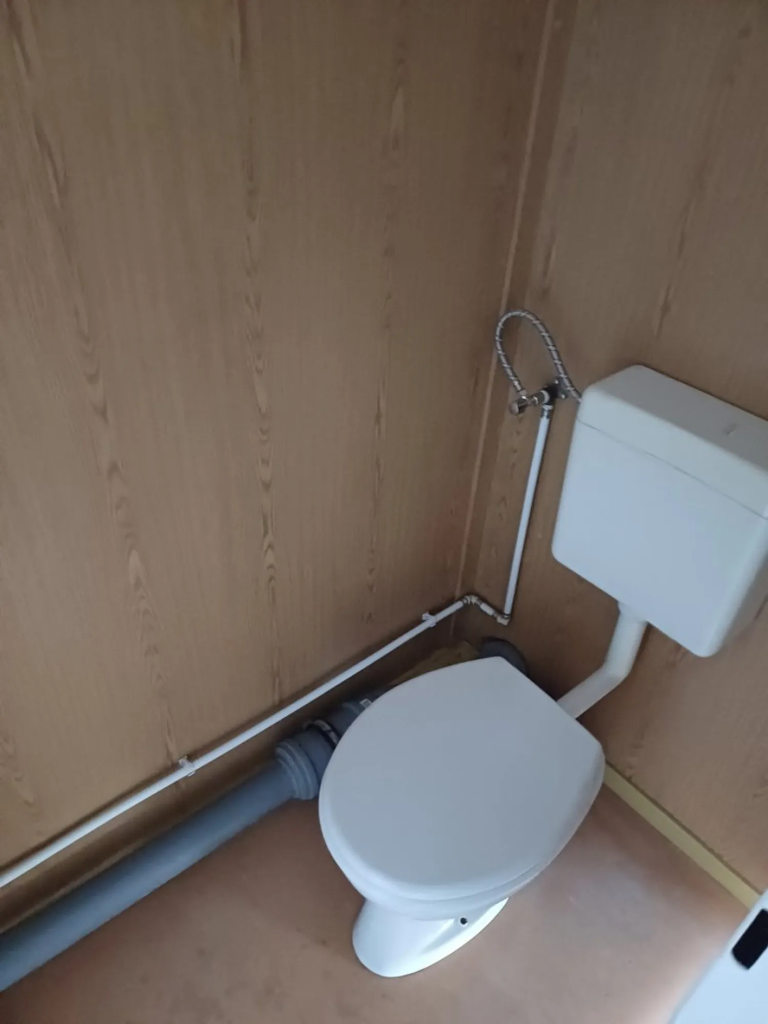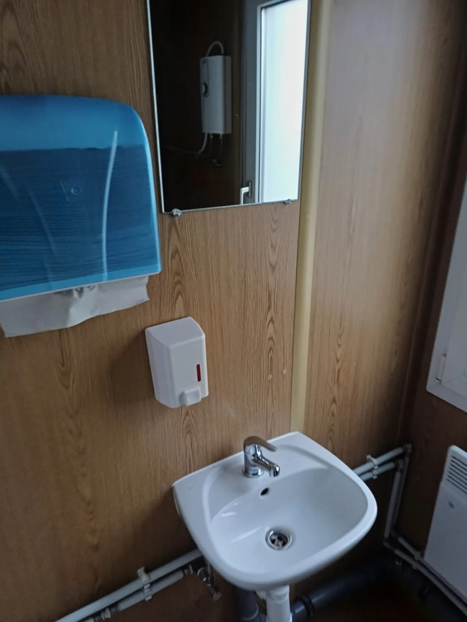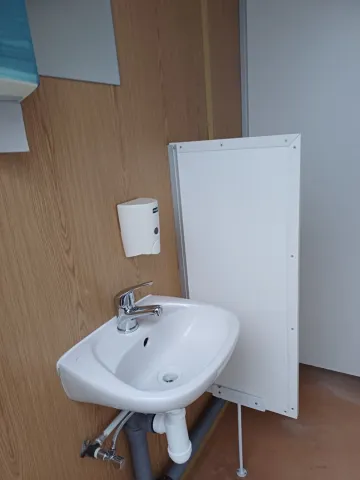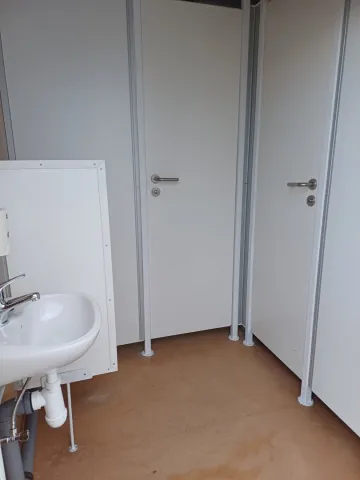 Vybavení: 1x venkovní dveře, 1x okno otevíravě-sklopné, 1x toaletní kabina s vnitřními dveřmi a keramickým WC, 1x pisoár, 1x sprchovací kabina s vnitřními dveřmi a sprchovým boxem, 2x keramické umyvadlo, 1x průtokový ohřívač vody