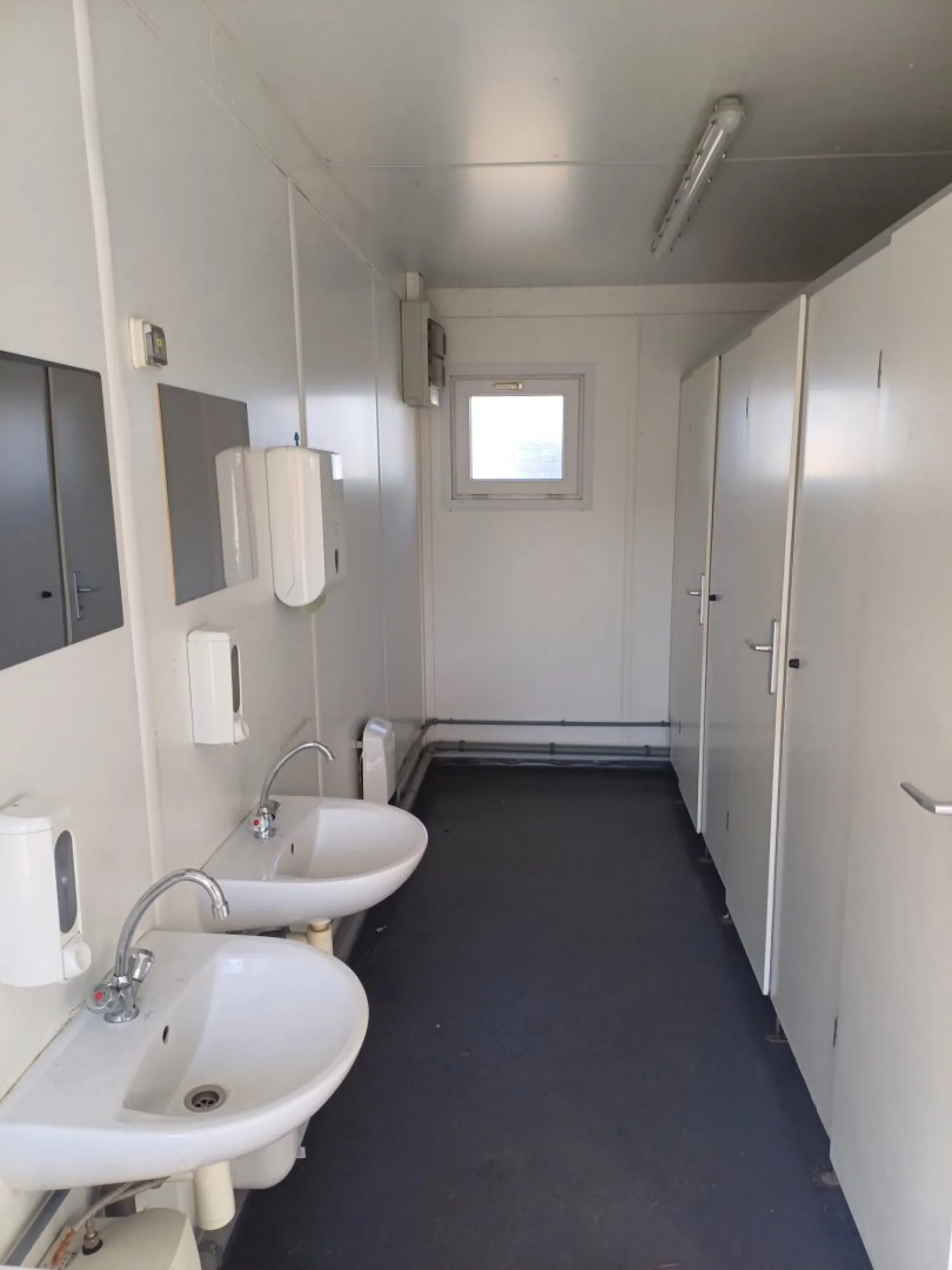 Vybavení: 1x venkovní dveře, 3x vnitřní dveře, 2x sanitární okno, 3x WC kabina včetně WC, 3x pisoár, 3x umyvadlo