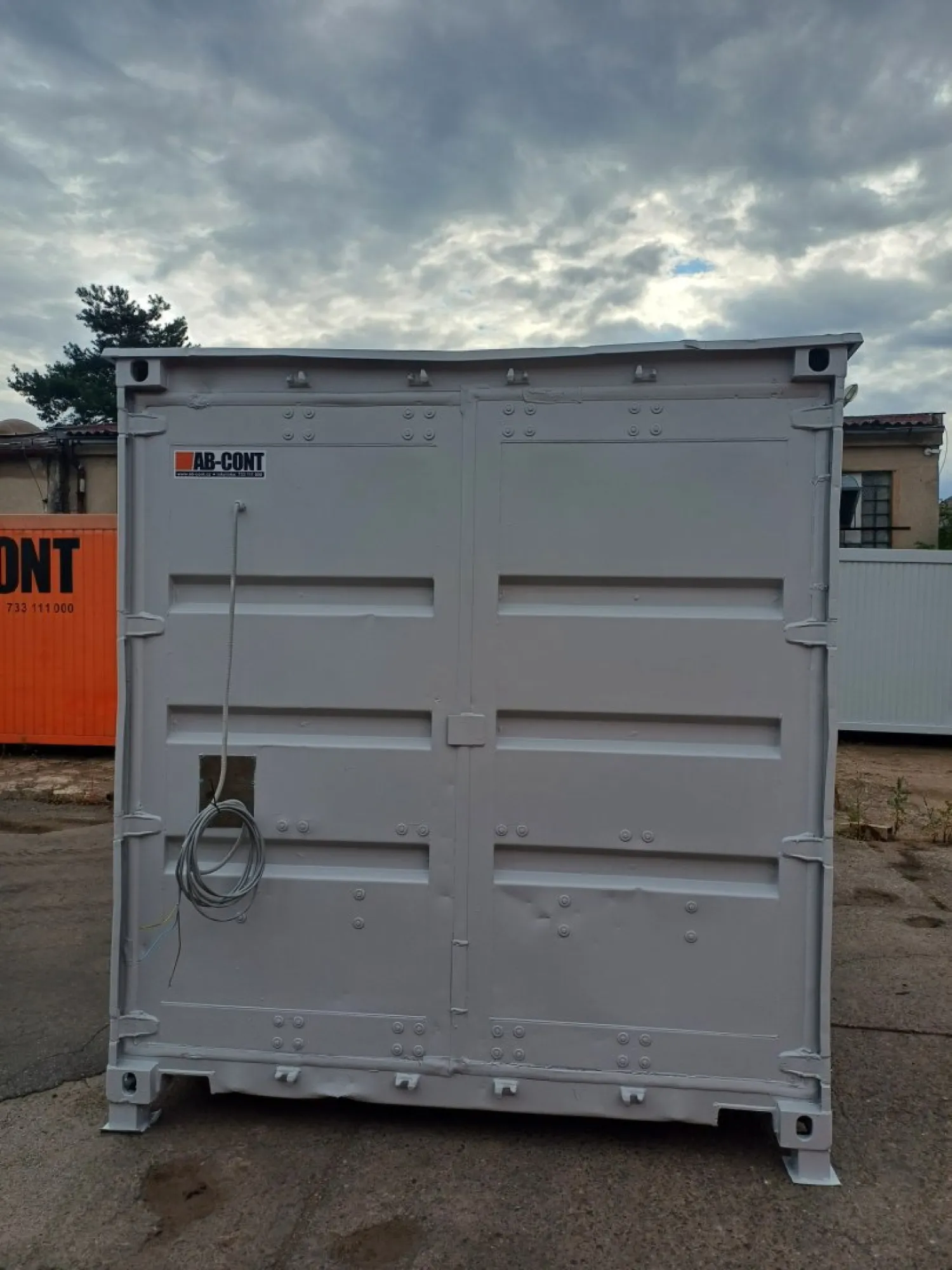 Kontejner je vybaven 1x dveřmi, 1x oknem a elektroinstalací: 2x zářivka, 1x rozvaděč, 1x vypínač, 3x zásuvka, 1x přívod 220 V, revize-elektro. Kabelkanál a topení budou odstraněny.