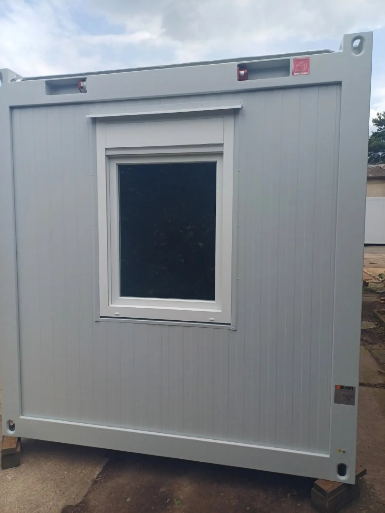 Stavební buňka AB3 v barvě RAL 7035. Stěny buňky jsou z PUR panelů tl. 80 mm. Buňka má rozměr 3000x2435 mm a je vybavena oknem a dveřmi.