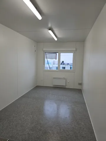 Stavební buňka o rozměru 8000x3000 mm. Barva buňky je RAL 6013. Buňka je vybavena 1x venkovními dveřmi, 1x oknem 1768x1330 mm, 1x oknem 907x1330 mm a 2x sanitárním oknem 600x450 mm. Vnitřní prostor tvoří předsíňka, ze které vedou dveře do koupelny a hlavní místnosti. Koupelna je vybavena WC, sprchou, bojlerem a umyvadlem. Hlavní místnost je vybavena kuchyňkou obsahující ledničku, myčku, pracovní plochu s dřezem a horní skříňky.