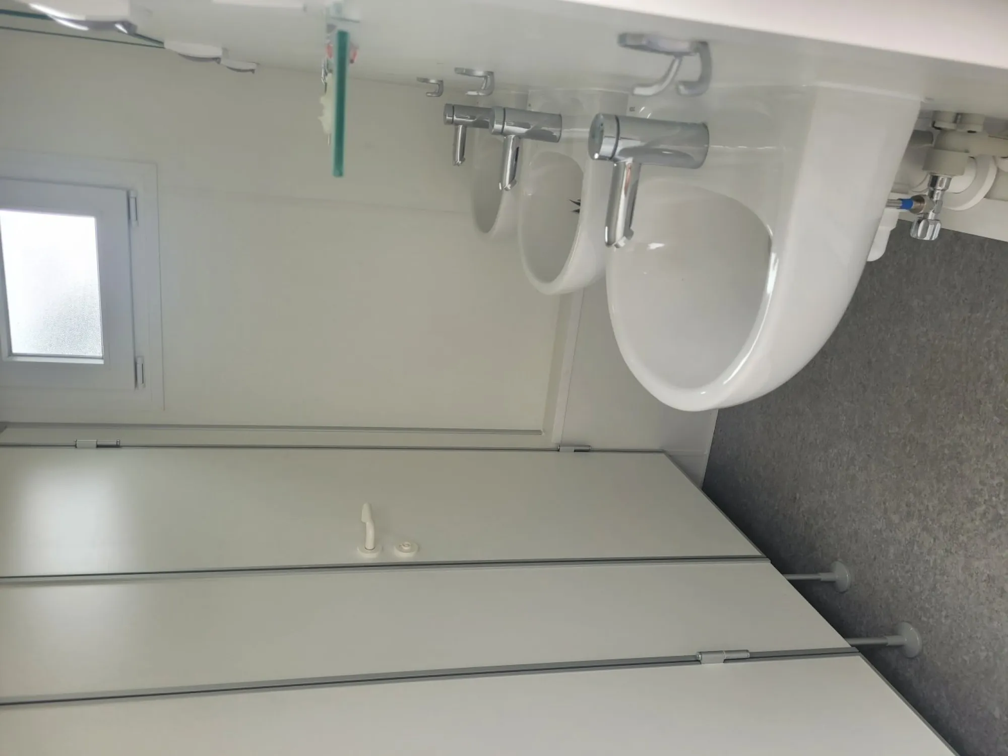 Sanitární buňka SB5. Buňka je rozdělena na dvě části se samostatnými vchody. V každé části jsou WC kabiny a umyvadla. V části pro muže jsou navíc pisoáry.