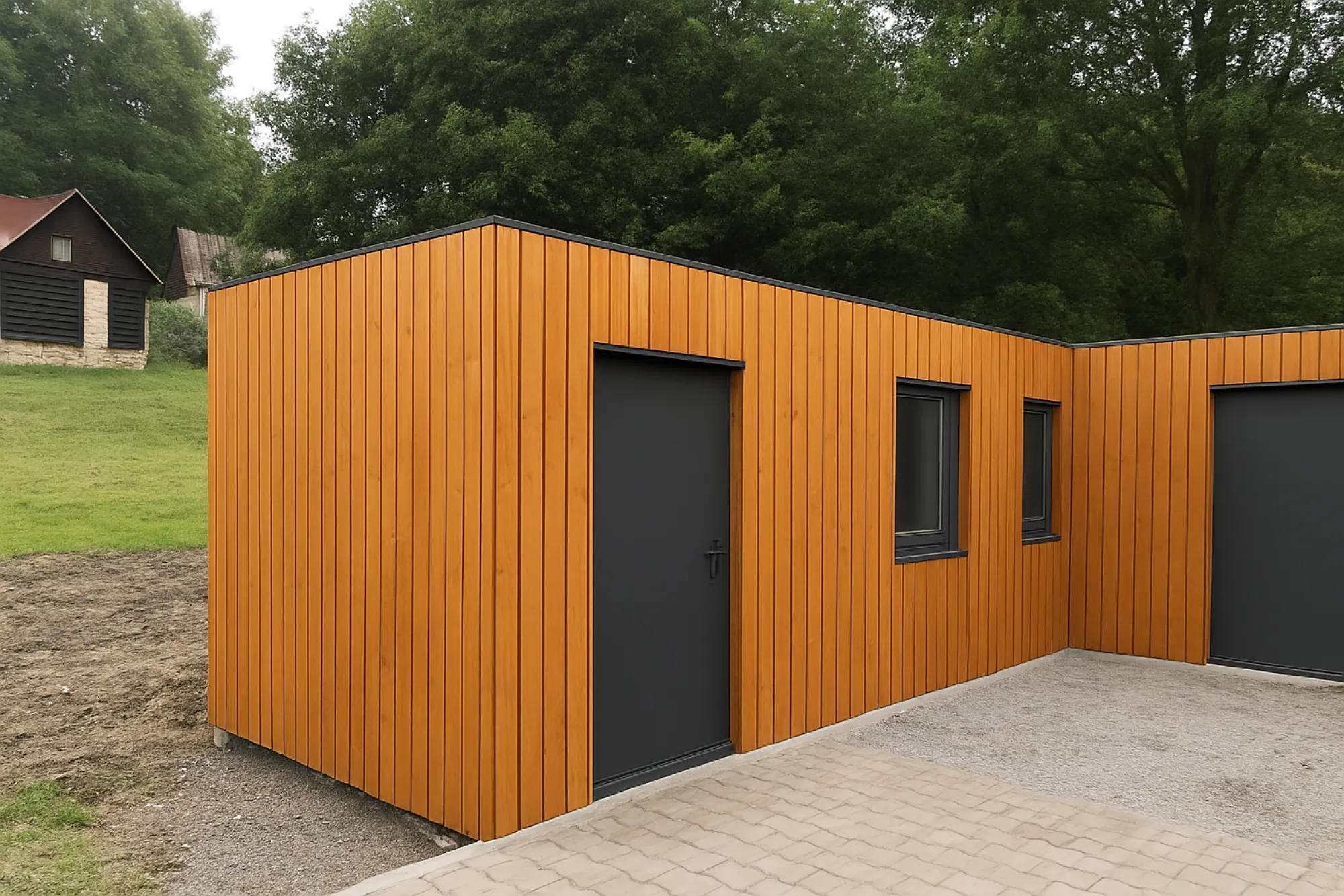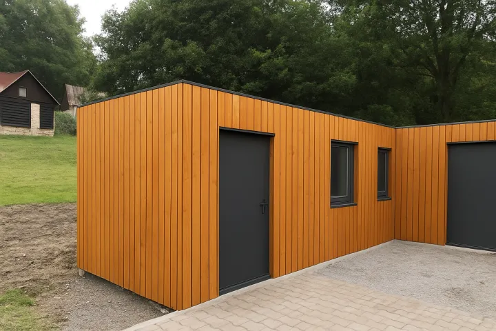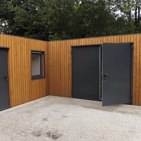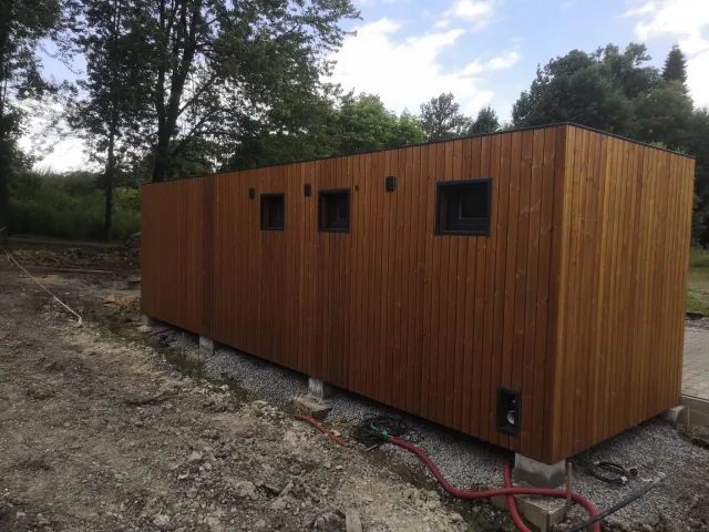 Pro zákazníka jsme realizovali dodávku a montáž dvou stavebních buněk spojených do tvaru L. První buňka má rozměry 6 × 2,5 m, druhá 6,5 × 2,5 m. Vnitřní prostor je vybaven sanitárním zařízením, zahrnujícím toalety, umyvadla a samostatně oddělený prostor pro zajištění komfortu a soukromí uživatelů.Celá sestava je zvenku obložena hladce hoblovanými prkny Thermowood, která zajišťují moderní vzhled, dlouhou životnost a vysokou odolnost vůči povětrnostním vlivům.